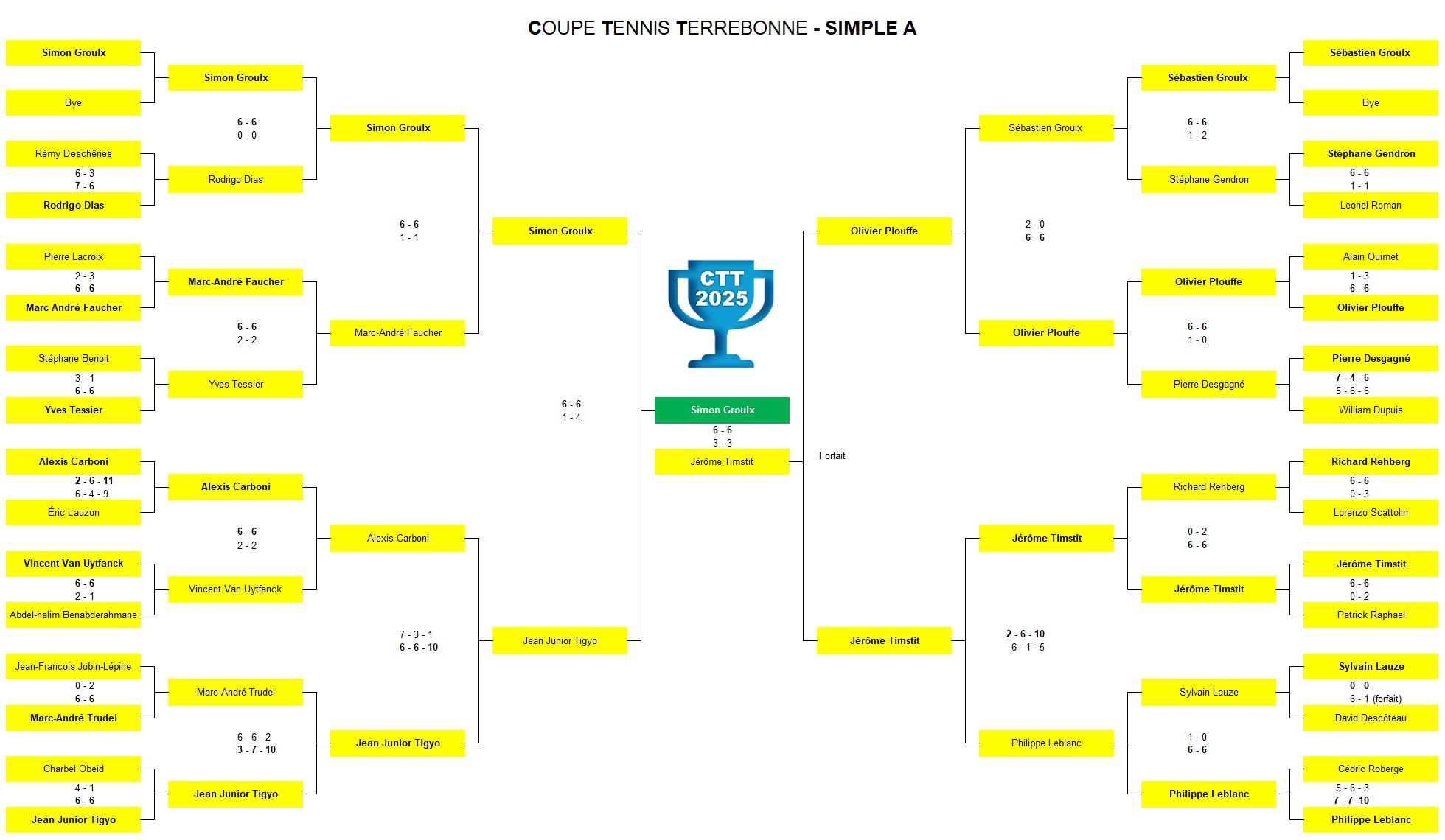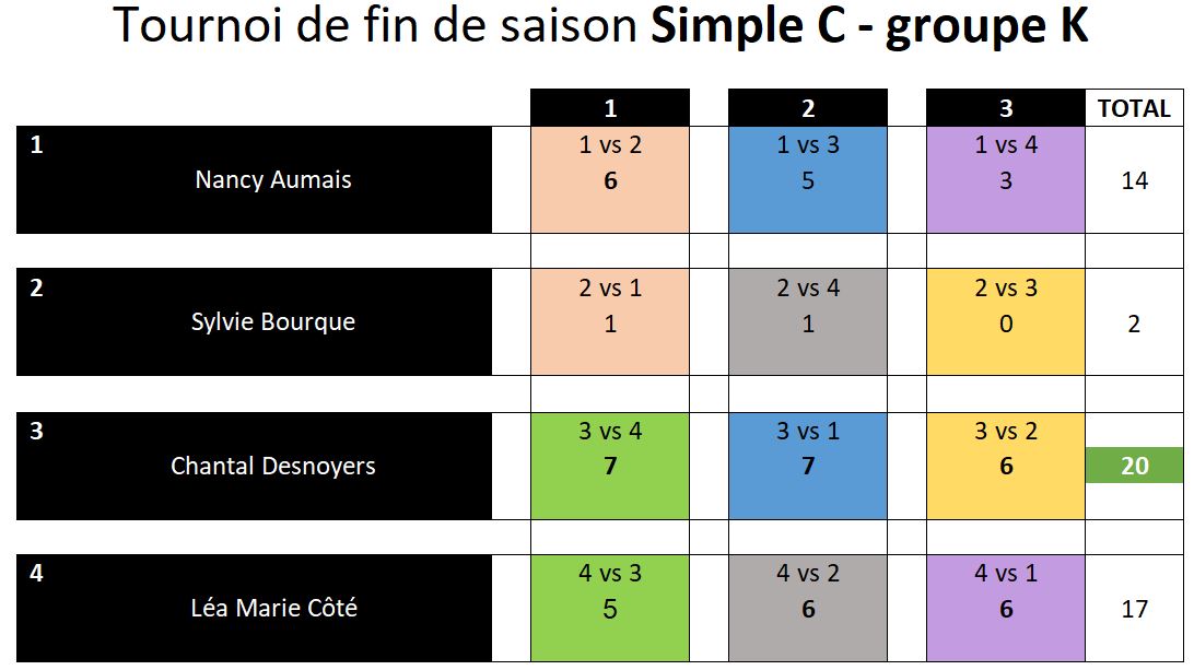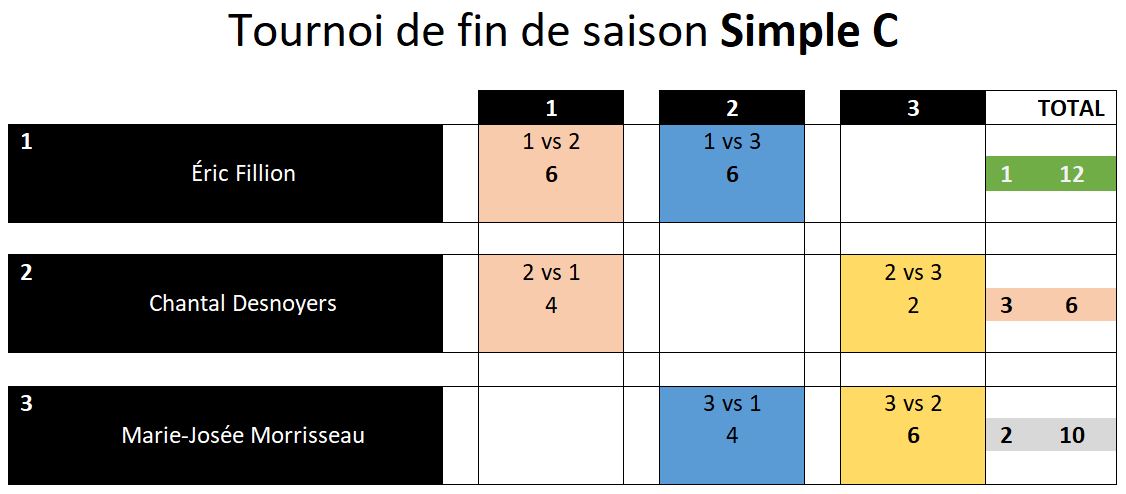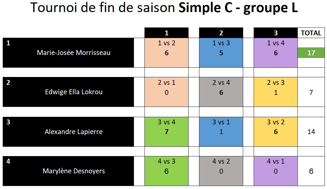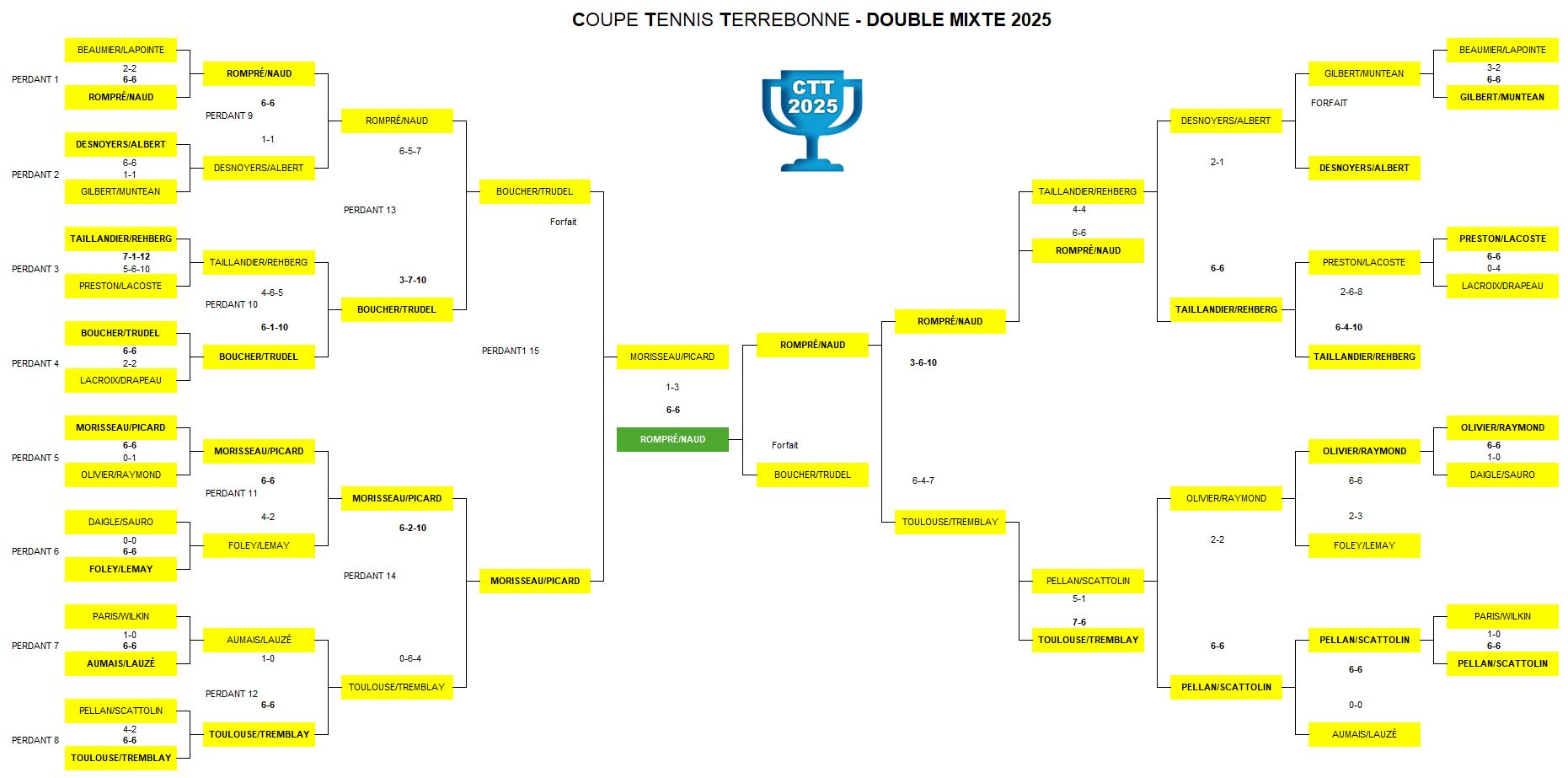 Merci à tous et toutes les participantes/participantes, ce fût un très beau tournoi grâce à vous tous. Nous aimerions remercier Jerry Jean et Marie-Ève Boucher d’avoir aidé en remplacement de dernière minute.