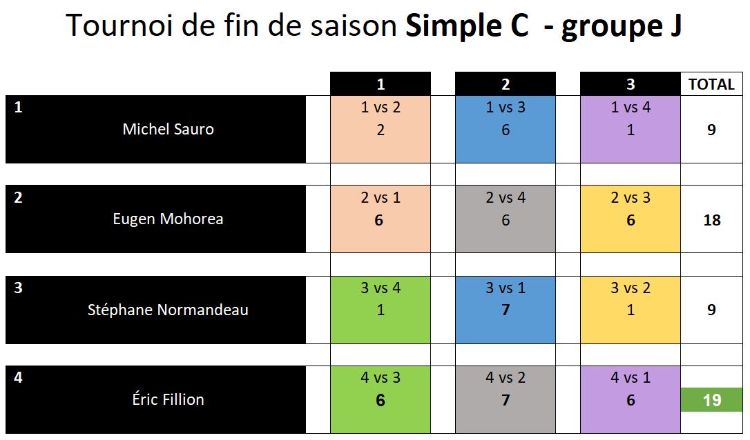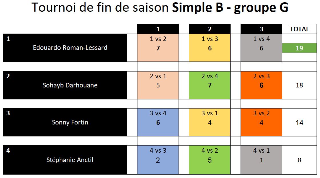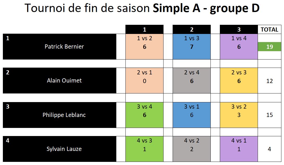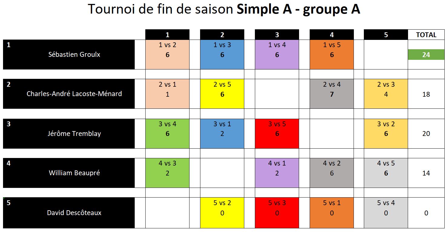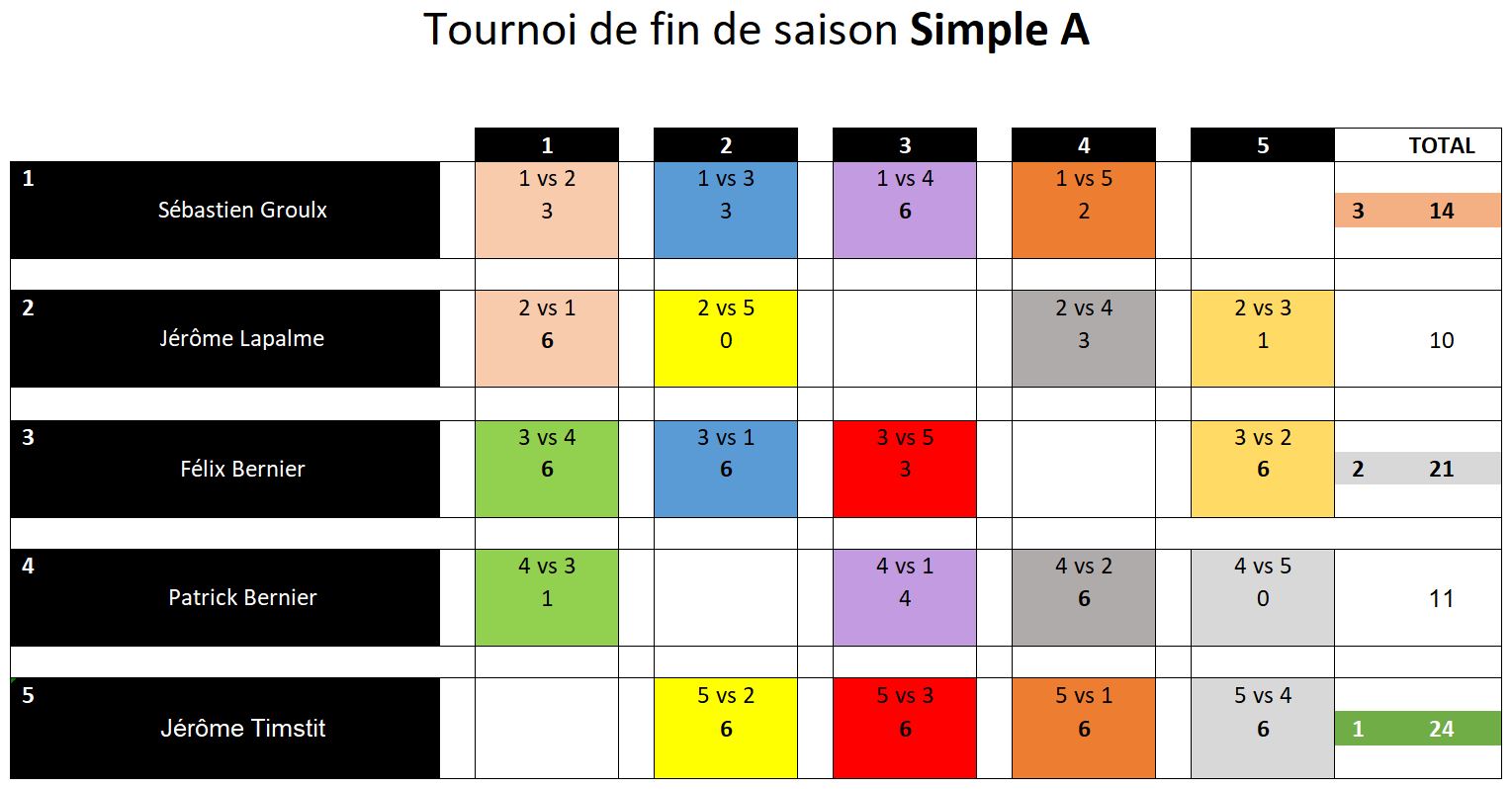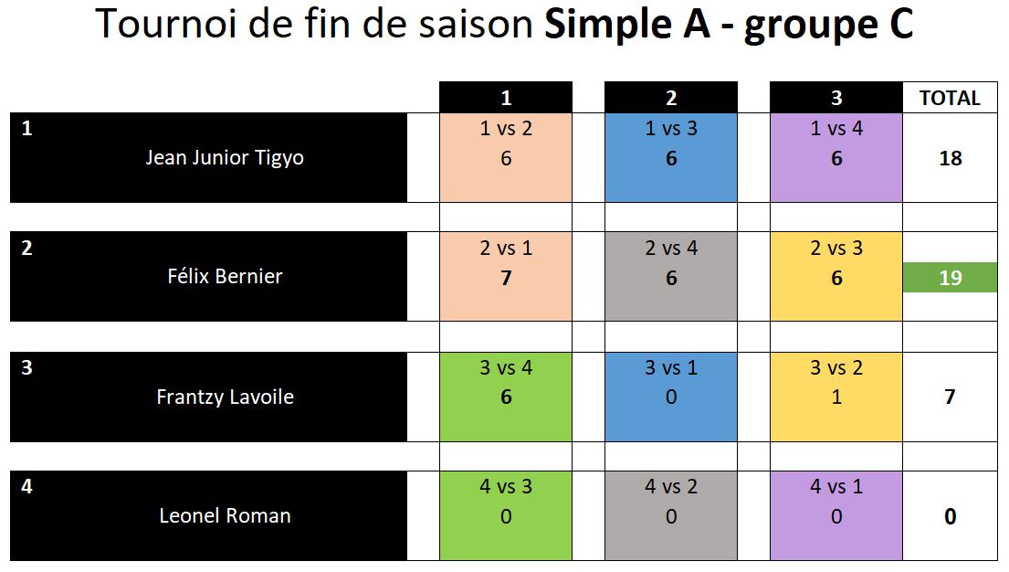 Notre 3e tournoi de la saison est maintenant terminé. Dame nature n’a pas voulu que nous finissions ça jeudi soir, mais nous avons réussi hier soir de finir toutes les parties. Nous avons eu 36 participants/participantes qui ont représenté un des 4 pays (Canada, Grèce, Allemagne et le Brésil). Après 72 parties en simple et en double, le Canada est l’équipe qui a accumulé le plus de points. Voici les résultats :