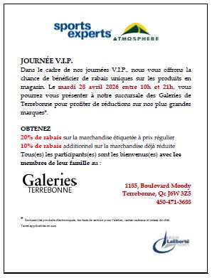 Journée VIP du printemps 2026, qui se tiendra au Sports Experts des Galeries de Terrebonne, le mardi 28 avril 2026, de 10 h à 21 h.